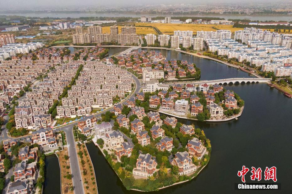 10月30日,航拍江苏丹阳市界牌新村,依湖而建的农民集中居住区如花朵般盛开在大地。据悉,占地1500亩的界牌新村集住宅楼、别墅、社区服务中心、中小学幼儿园、医院于一体,极大地改善了当地民众的生活条件。中新社记者 泱波 摄
