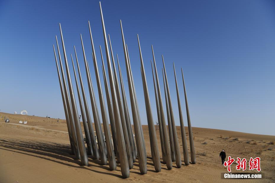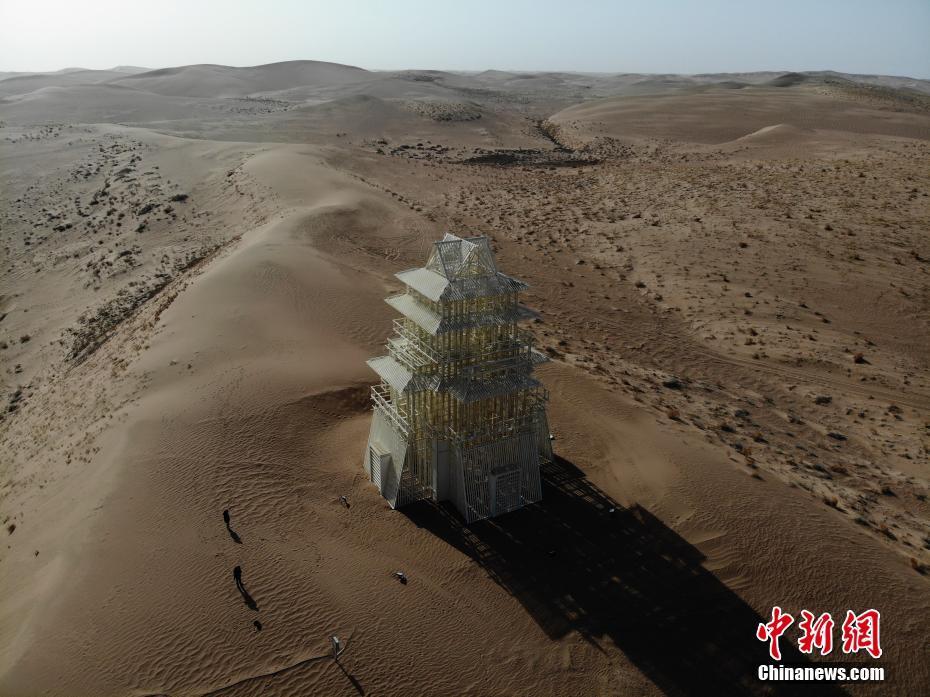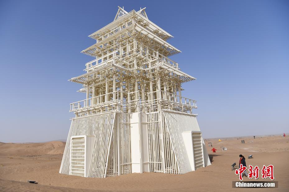 3月13日,在甘肃民勤县沙漠雕塑艺术公园拍摄的雕塑《星光阁》。作品以白色为基调,采用线条式搭建,在一望无际的沙海中如海市蜃楼般如梦如幻。中新社记者 杨艳敏 摄