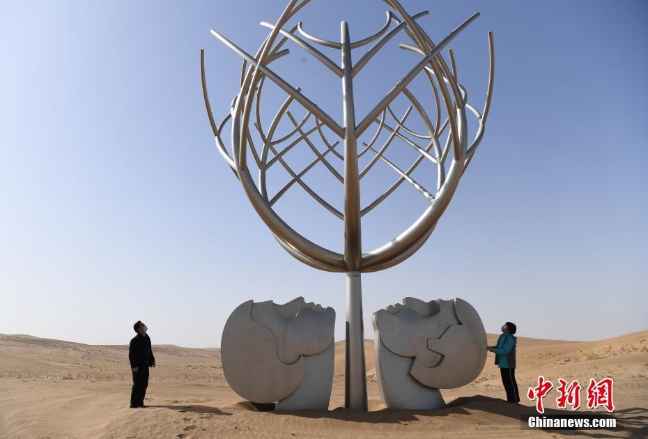 3月13日,在甘肃民勤县沙漠雕塑艺术公园拍摄的雕塑《交流》。该作品表现的是人类与自然相遇的十字路口,人们在这里相聚,共享阴凉,共话未来。中新社记者 杨艳敏 摄
