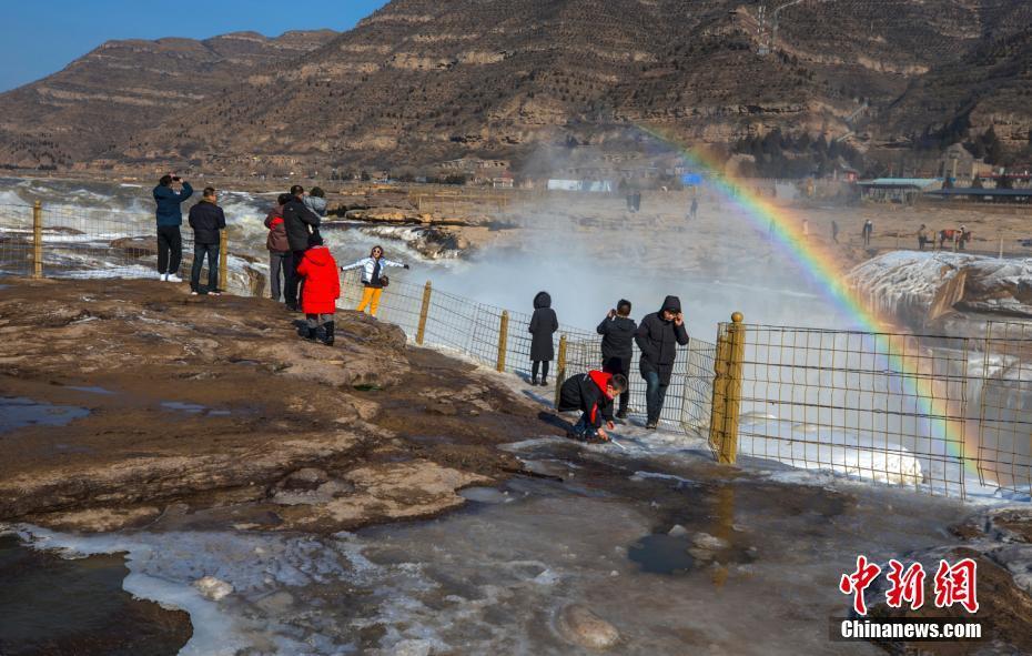 1月14日,陕西黄河壶口瀑布水流湍急,巨浪翻滚,溅起巨大水雾腾空而起。瀑布两岸冰凌素裹,冰峰倒挂,晶莹剔透。瀑布旁边彩虹呈弧形从天际插入水中,似长龙吸水,色彩斑斓,蔚为壮观,吸引了不少游人观赏拍照留念。 兰华 摄