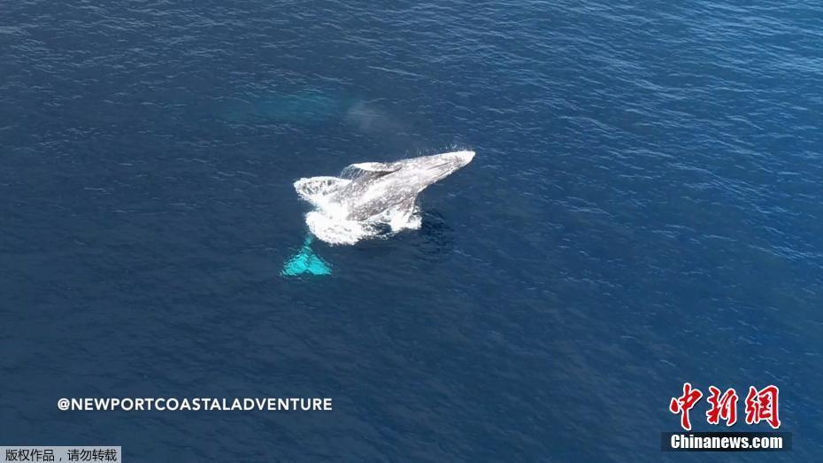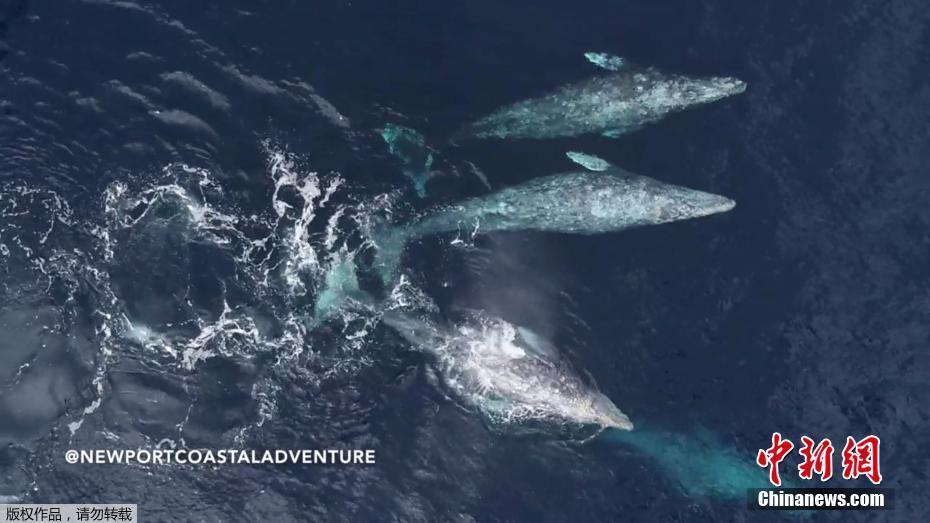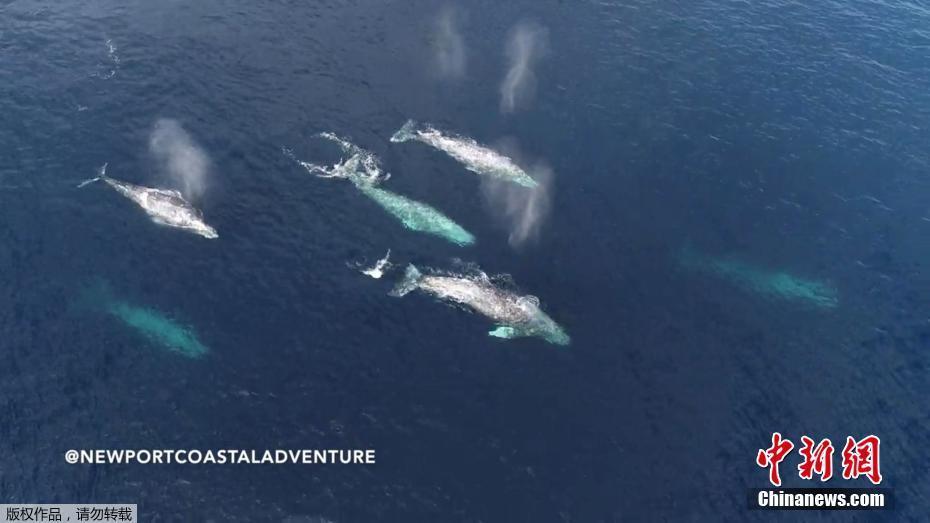 美国加州新港出现成群灰鲸 惬意游弋时而跃出海面
