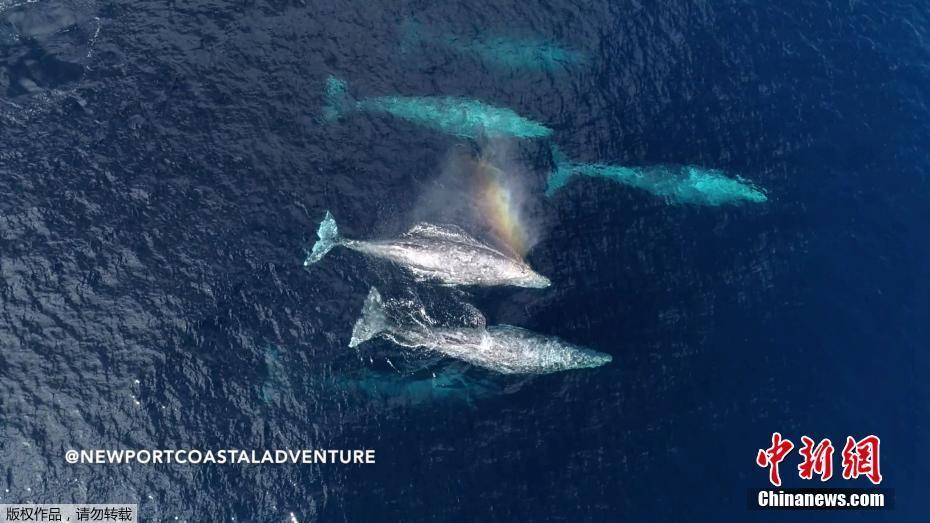 当地时间1月22日,美国加州新港出现成群灰鲸,时而越出水面,时而喷出水柱形成小彩虹。