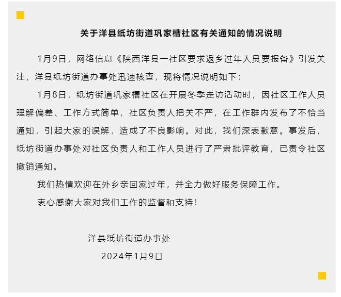 1月9日,网络信息《陕西洋县一社区要求返乡过年人员要报备》引发关注,洋县纸坊街道办事处迅速核查,现将情况说明如下: