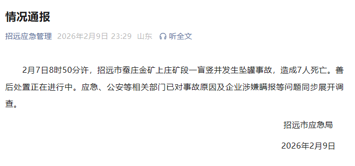 2月7日8时50分许,招远市蚕庄金矿上庄矿段一盲竖井发生坠罐事故,造成7人死亡。善后处置正在进行中。应急、公安等相关部门已对事故原因及企业涉嫌瞒报等问题同步展开调查。