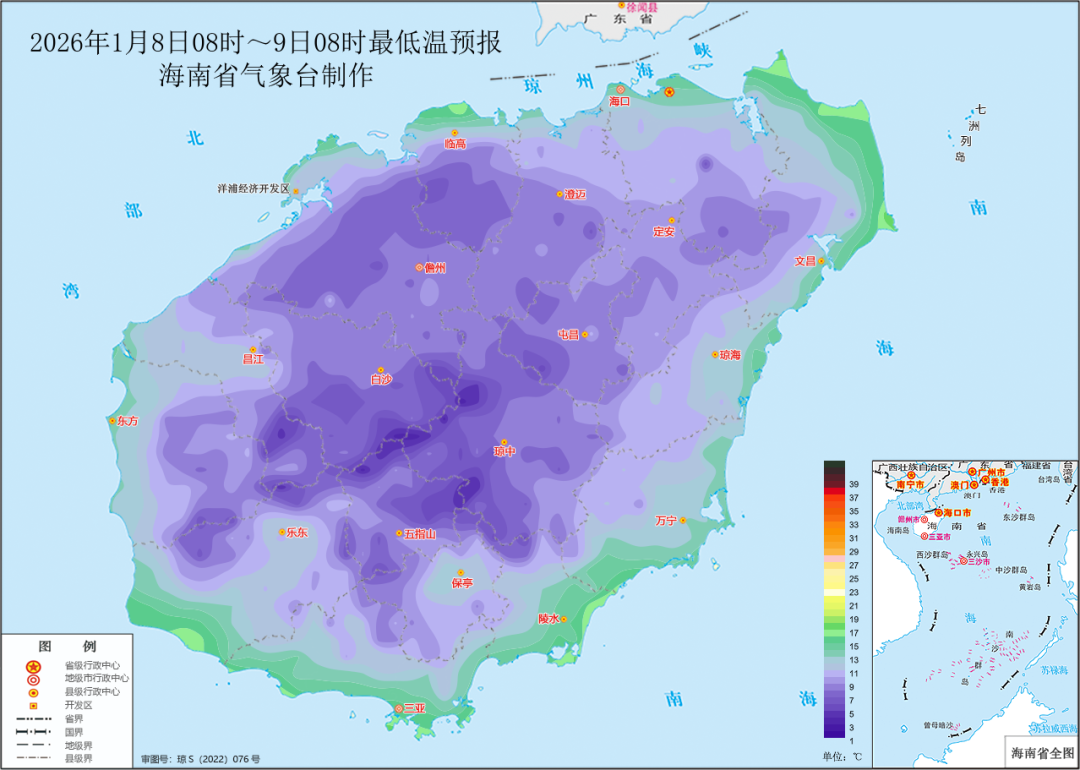受较强冷空气影响,1月7日8时至8日8时,全岛18个市县共162个乡镇(区)的最低气温低于10℃,琼中、临高、五指山、海口、澄迈、儋州、乐东、屯昌、白沙、定安、保亭、昌江和文昌13个市县共53个乡镇(区)的最低气温低于7℃,最低为琼中县红毛镇2.8℃。