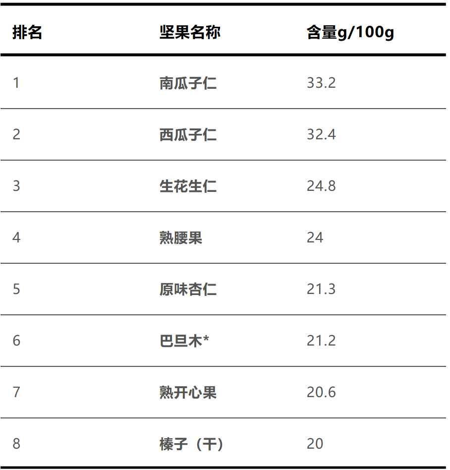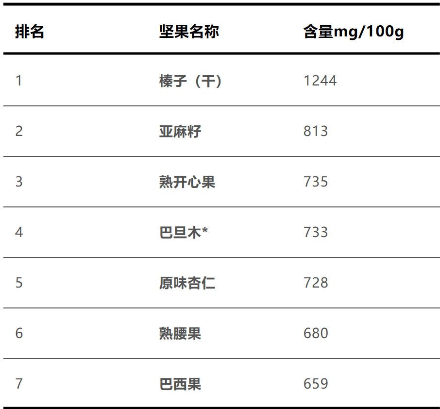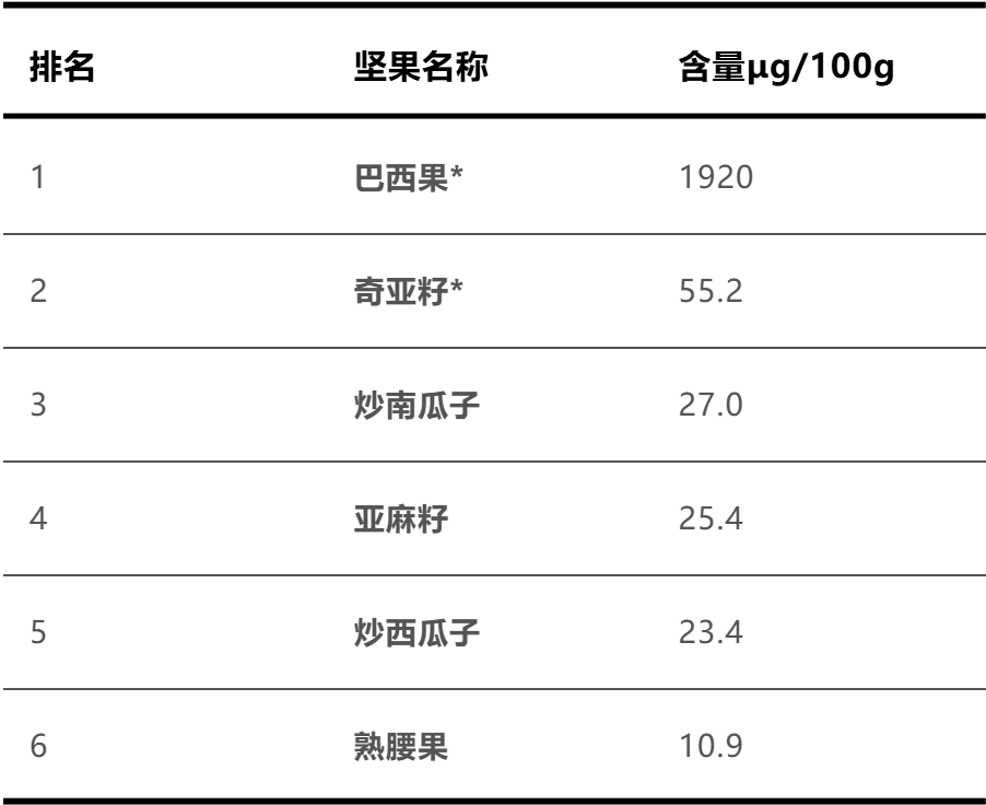 硒属于抗氧化剂,具有免疫调节功能,缺硒不仅会降低免疫力,还可能会诱发某些甲状腺疾病。巴西果的硒含量高的惊人,我们对硒的需求量是60微克/天,吃1颗(大约5克)就能摄入96微克,可满足一般人群每日硒需求量的160%。