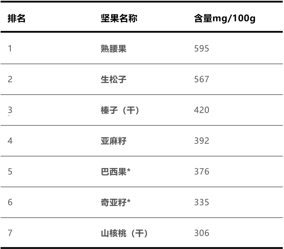 充足的镁摄入对骨骼健康、血压健康以及心血管健康都有益。吃10克熟腰果、生松子或榛子,就能满足一般人群每天镁需求量的15%左右了。