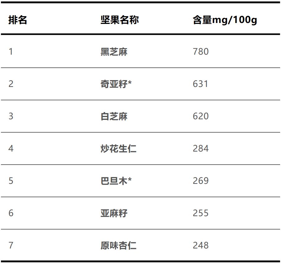 饮食中充足的钙摄入能增强骨质,预防骨质疏松。虽然坚果中的钙吸收率不如牛奶,但仍然对补钙有些帮助。黑芝麻、奇亚籽、白芝麻钙含量还算丰富。