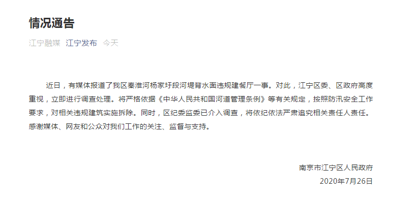 近日,有媒体报道了我区秦淮河杨家圩段河堤背水面违规建餐厅一事。对此,江宁区委、区政府高度重视,立即进行调查处理。将严格依据《中华人民共和国河道管理条例》等有关规定,按照防汛安全工作要求,对相关违规建筑实施拆除。同时,区纪委监委已介入调查,将依纪依法严肃追究相关责任人责任。感谢媒体、网友和公众对我们工作的关注、监督与支持。