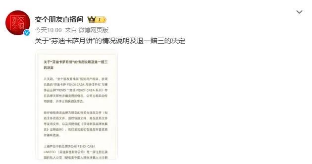 更早前,罗永浩的交个朋友直播间发布声明称,发现销售的“芬迪卡萨 FENDI CASA 月饼伴手礼”与真正的奢侈品品牌“FENDI”(包括FENDI CASA系列)并无实际关联,涉嫌品牌造假。公司进行调查后,停止了相关商品的销售并对所有购买用户先行赔付,退一赔三。