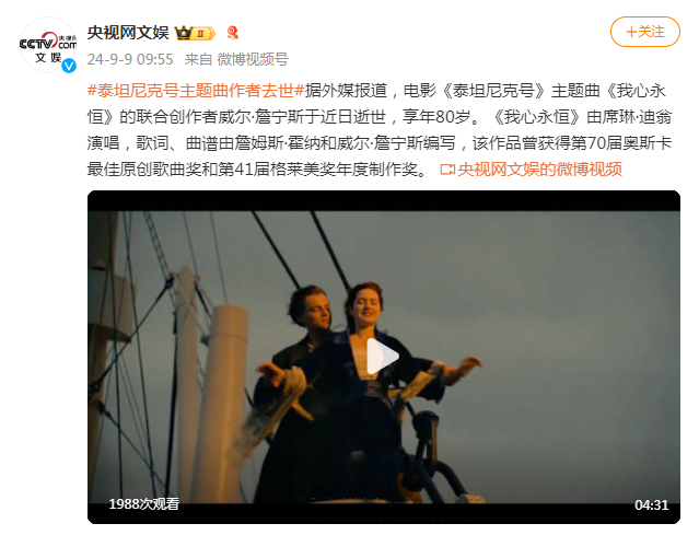 据外媒报道,电影《泰坦尼克号》主题曲《我心永恒》的联合创作者威尔·詹宁斯于近日逝世,享年80岁。《我心永恒》由席琳·迪翁演唱,歌词、曲谱由詹姆斯·霍纳和威尔·詹宁斯编写,该作品曾获得第70届奥斯卡最佳原创歌曲奖和第41届格莱美奖年度制作奖。