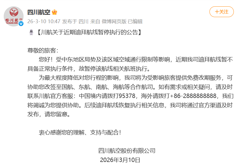 四川航空:迪拜航线暂不具备正常执行条件,可协助旅客改签至国航、东航、南航等合作航司