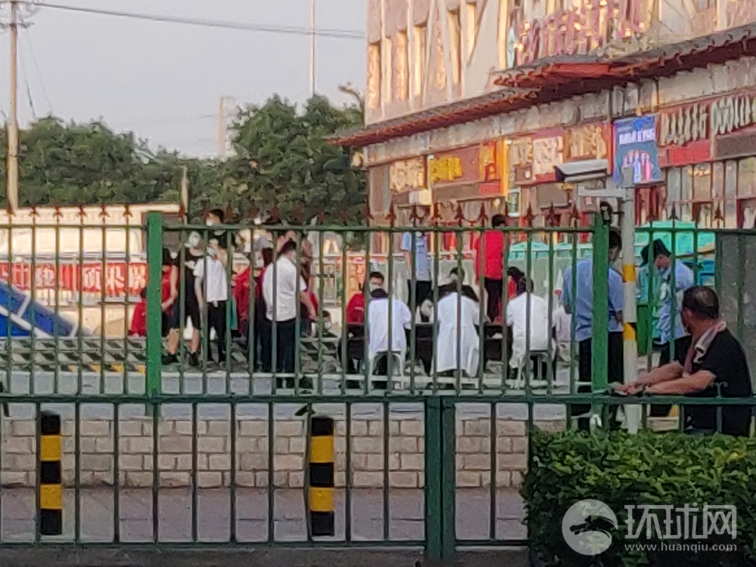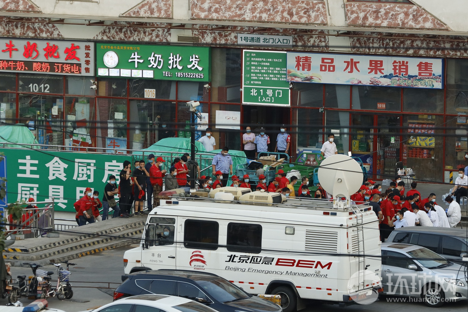 【环球时报-环球网报道 记者 李昊】北京新发地农副产品交易市场牛羊肉交易大厅已停业,相关工作人员在户外对商户进行信息登记和环境采样等工作。蔬菜区域如常经营。
