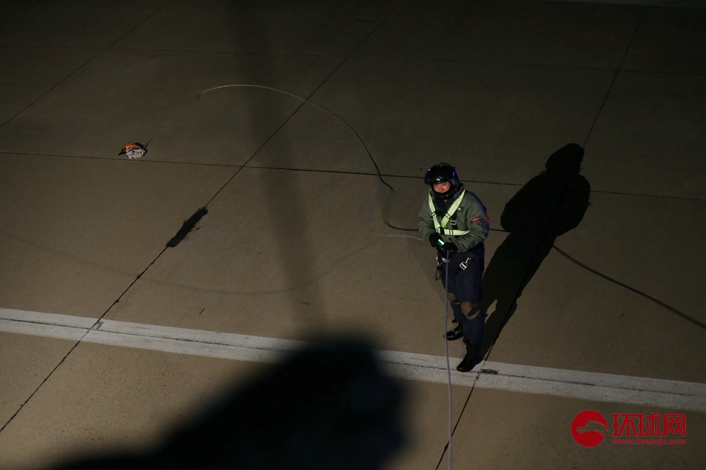 绞车手曹煜确定所有机上人员准备完毕后竖起大拇指,随后通过机上通讯系统通知机长起飞。摄影/崔萌