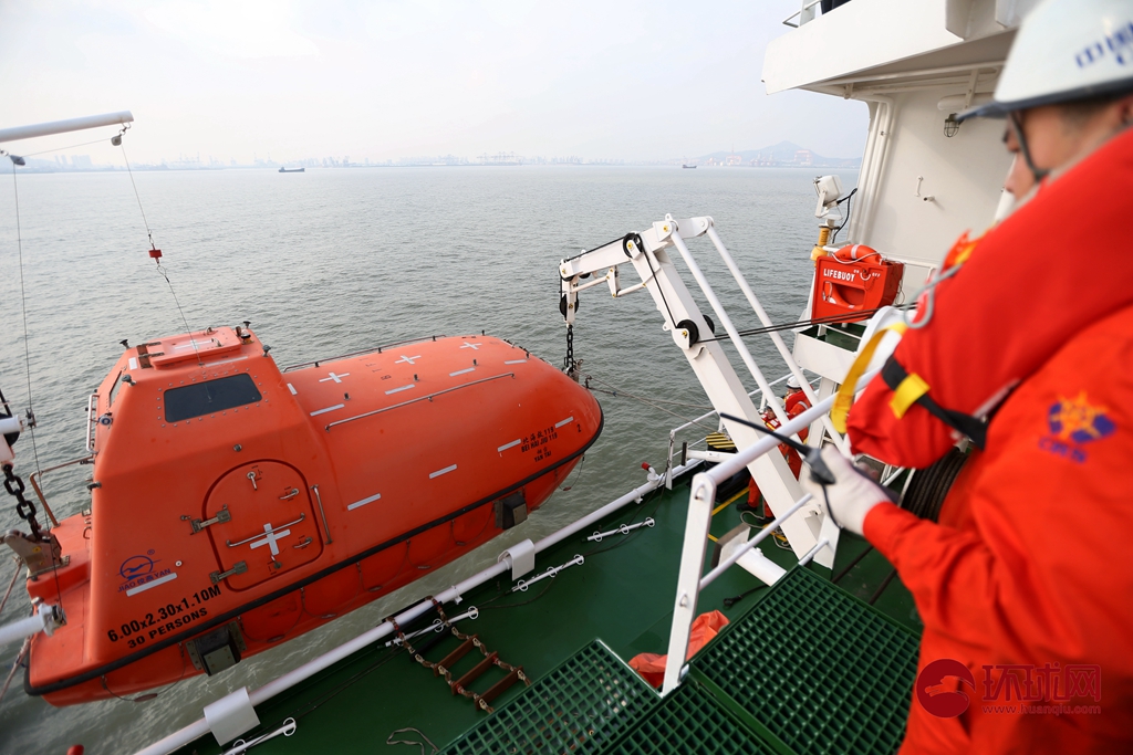 119轮船员们正在进行救生艇投放训练。摄影/崔萌