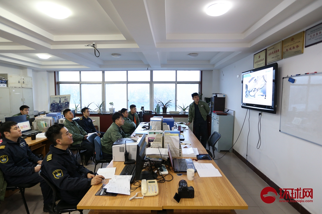 不出任务时,救助直升机组进行装备和救援知识的学习。摄影/崔萌