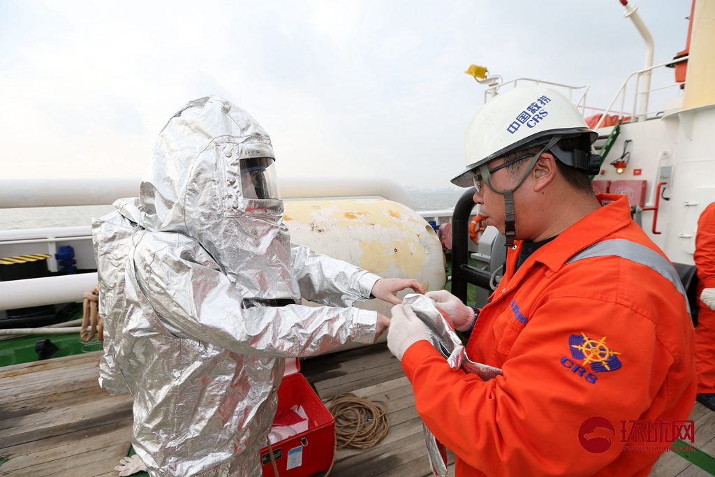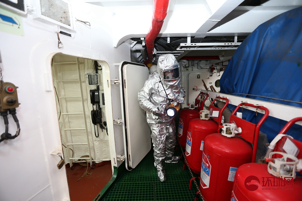 船长王全杰指挥队员进行船只消防演习。摄影/崔萌