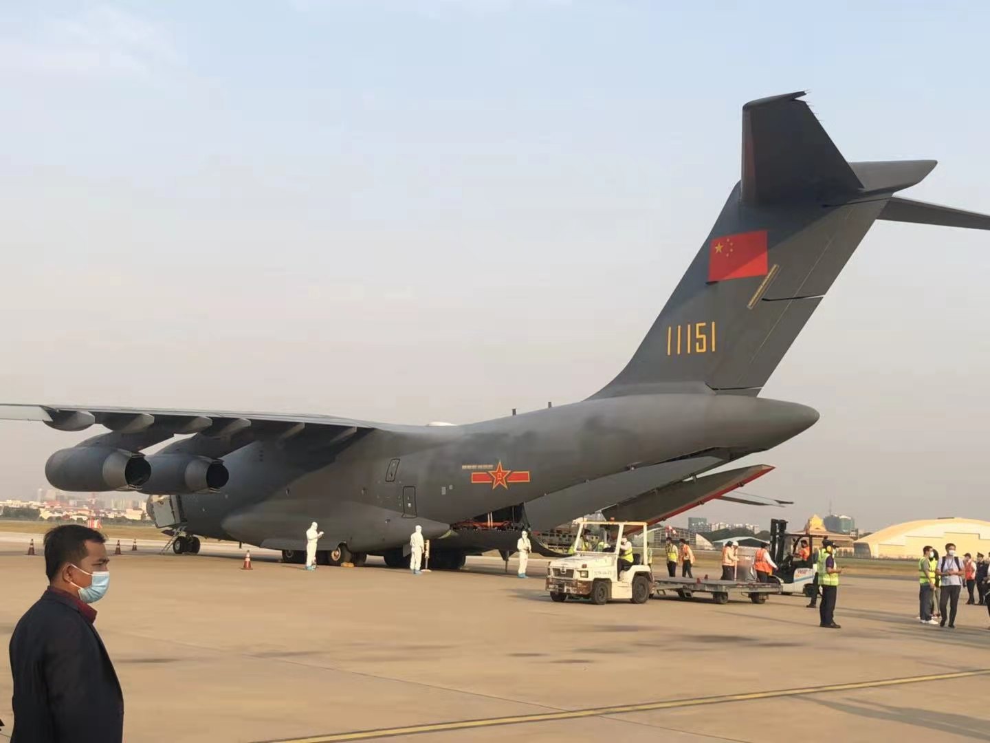 继2月1日,中国对外援助的第一批新冠疫苗由巴基斯坦空军专机运抵巴基斯坦,中国国防部7日下午宣布巴基斯坦军队成为首个接受中国军队新冠疫苗援助的外国军队。与此同时,柬埔寨军队也成为首批接受中国军队新冠疫苗援助的外国军队,图片显示运输疫苗抵达柬埔寨的是“明星飞机”运-20。