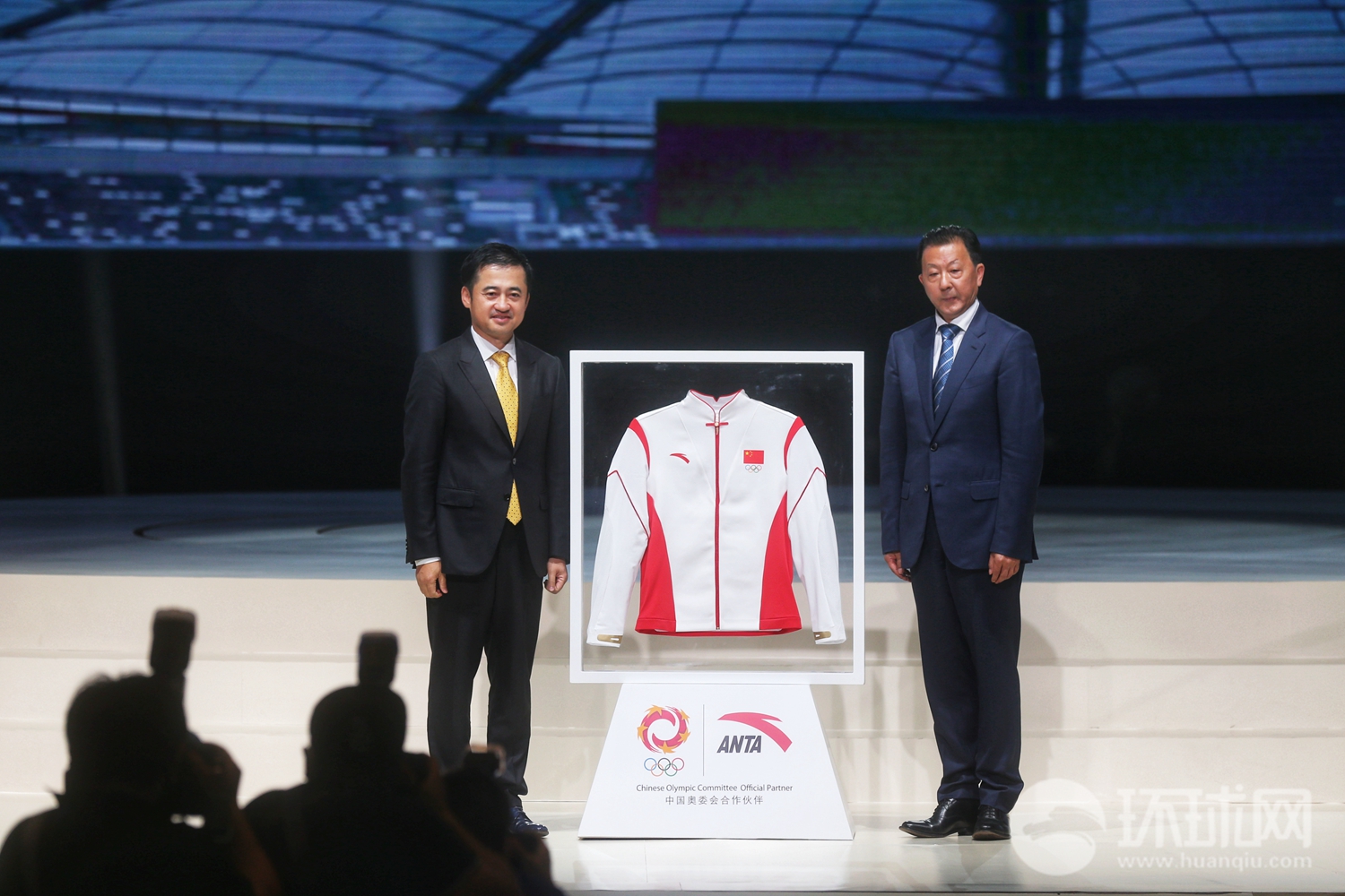安踏董事局主席兼CEO丁世忠与国家体育总局副局长与国家体育总局副局长、中国奥委会副主席李颖川对领奖服进行正式交接。