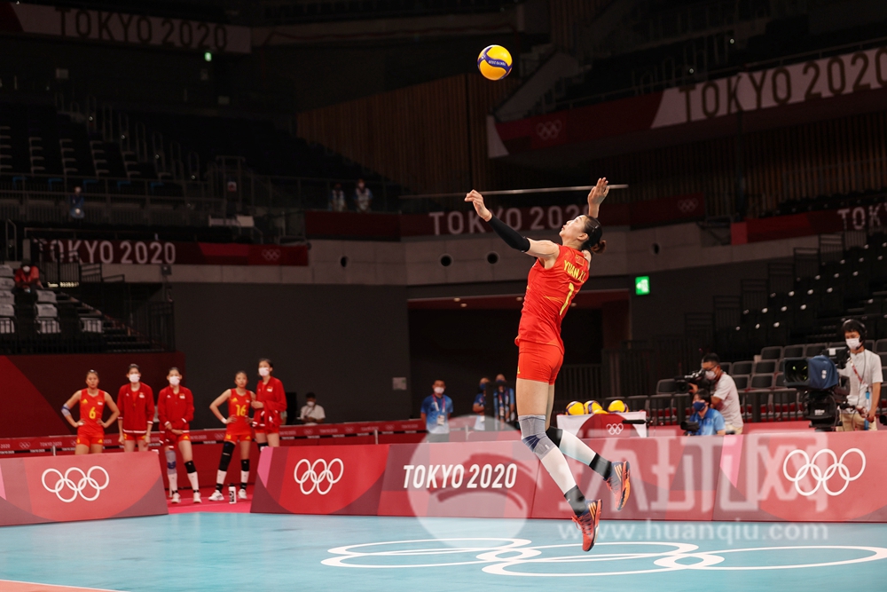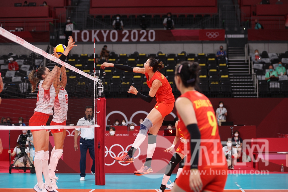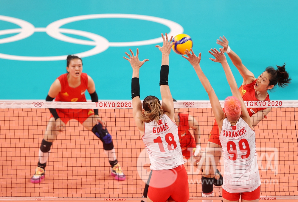 2021年7月25日,日本东京。中国女排在东京有明排球馆亮相,对阵东京奥运会第一个对手土耳其队。近乎疯狂的土耳其队以弱冲强发挥出高水平,中国女排拦网失控,从而以0比3爆冷负于土耳其队。(摄影:环球时报-环球网 崔萌)