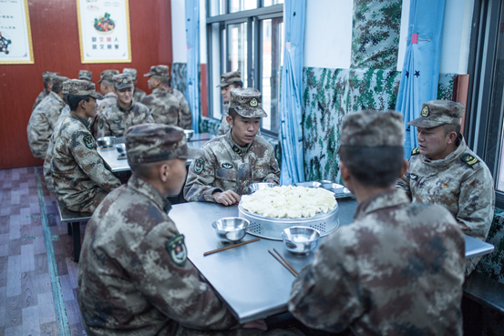 在“高原戍边模范营”3连,刚刚结束巡边任务的官兵,一起在连部食堂包起了饺子。比起吃月饼,这种聚在一起方式更能缓解他们的思乡之情。3连的战士告诉《环球时报》记者,虽然自己很想家,但是和生死相托的战友们在一起,也是一种团聚。
