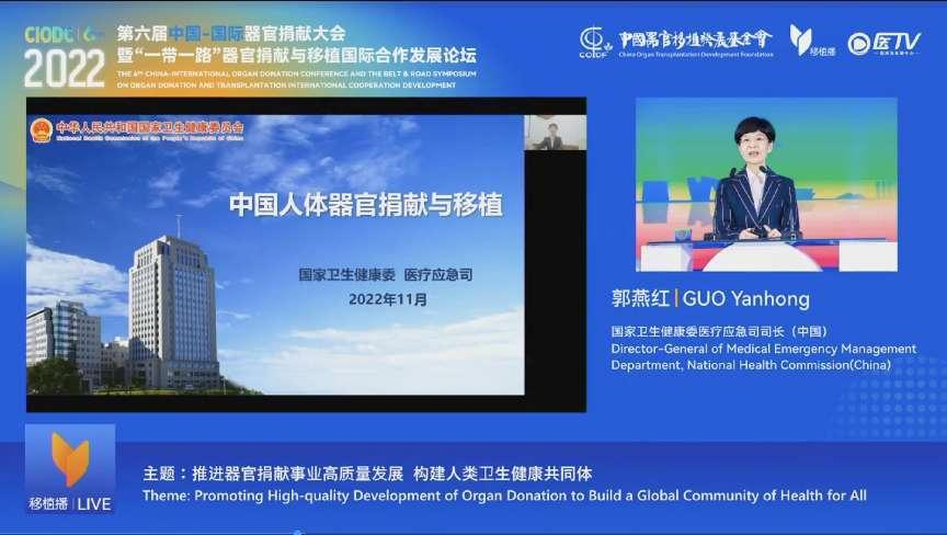 2022年12月9日,第六届中国-国际器官捐献大会(CIODC)暨“一带一路”器官捐献与移植国际合作发展论坛以线上会议的形式顺利召开。大会由国家卫生健康委员会、中国红十字会总会指导,中国器官移植发展基金会、中国人体器官捐献管理中心主办,西班牙DTI基金会、中东器官移植协会(MESOT)联合主办,国际器官移植协会、中国人体器官捐献与移植委员会、国际器官捐献与获取协会、亚洲器官移植协会、欧洲器官移植协会、非洲器官移植协会、拉丁美洲器官移植协会、欧洲器官捐献与移植协调组织等支持。