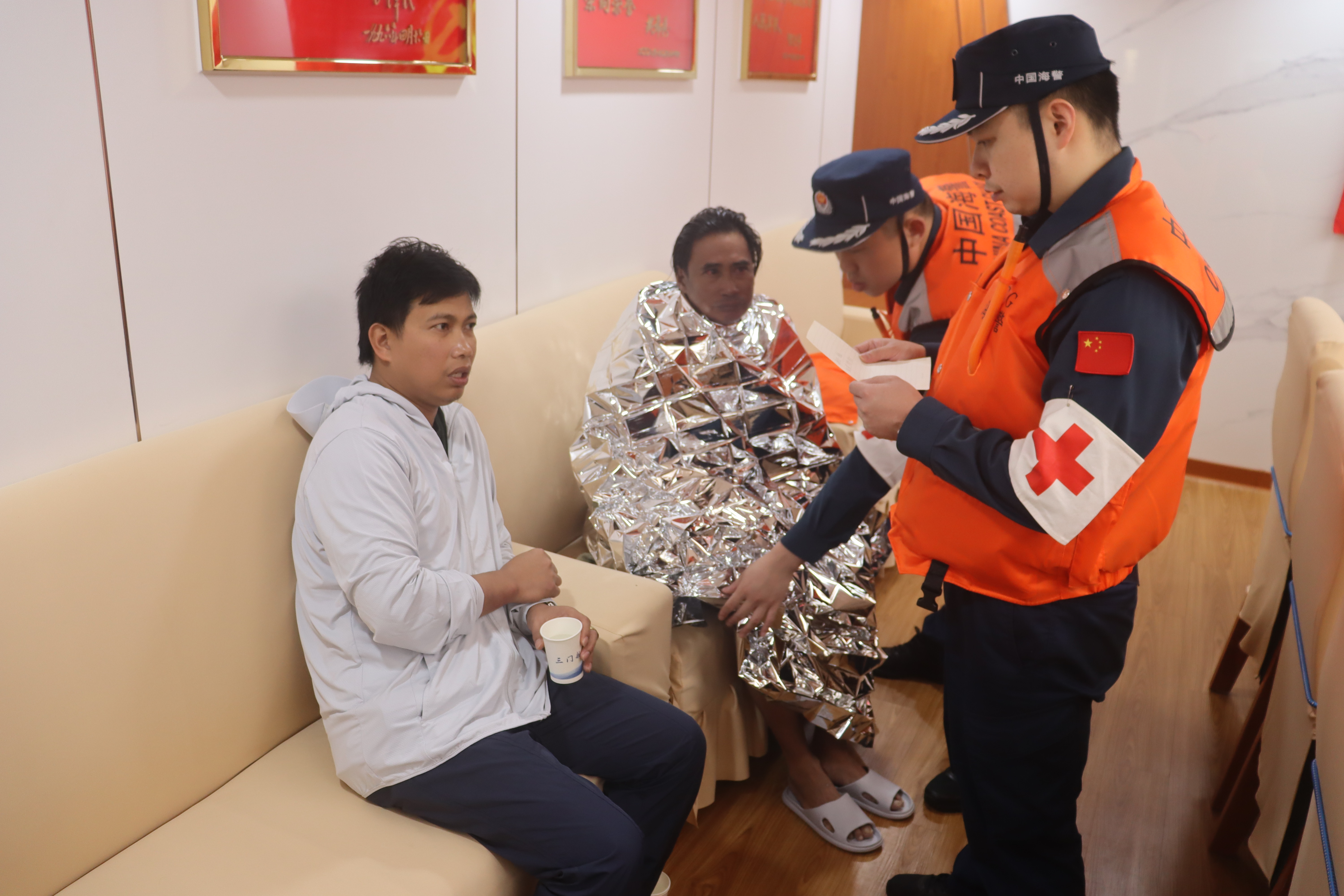 船员登舰后,海警医护人员第一时间为获救船员提供保暖、补水和心理治疗。针对呛水、擦伤、脱水等状况,开展呼吸道清理、伤口消毒包扎、生命体征监测等专业处置。对身体虚弱者安排专人陪护,实时观察状态。期间,海警执法员为菲籍船员专门划设了休整区,提供了温热粥品和饮用水。通过翻译人员沟通,船员情绪稳定,并表达了对中国海警的感谢。