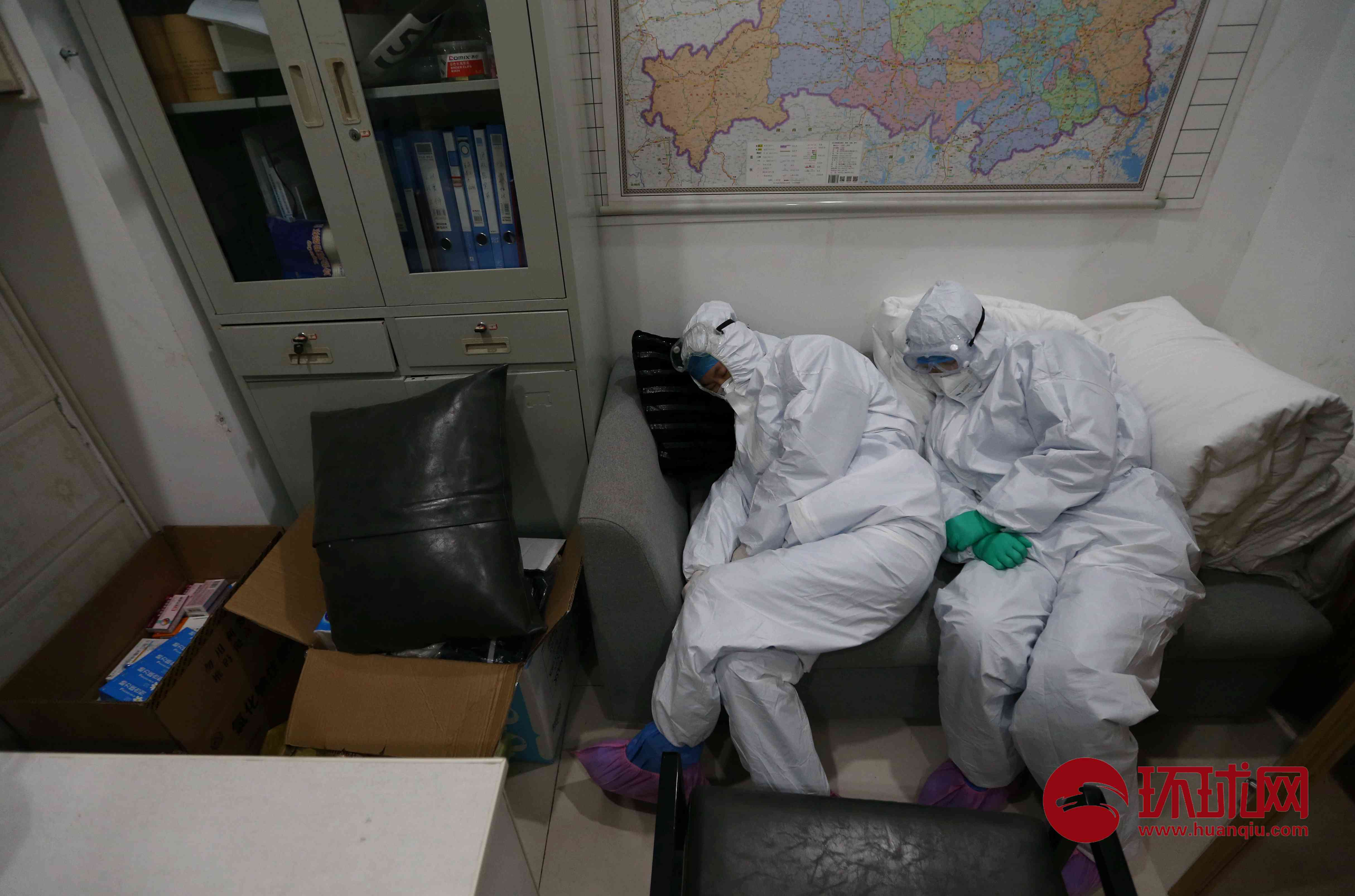 深夜两点半,今年33岁的护士马海乐(左)和1990年出生的护士袁红,在休息室的小沙发上进行短暂的休息。