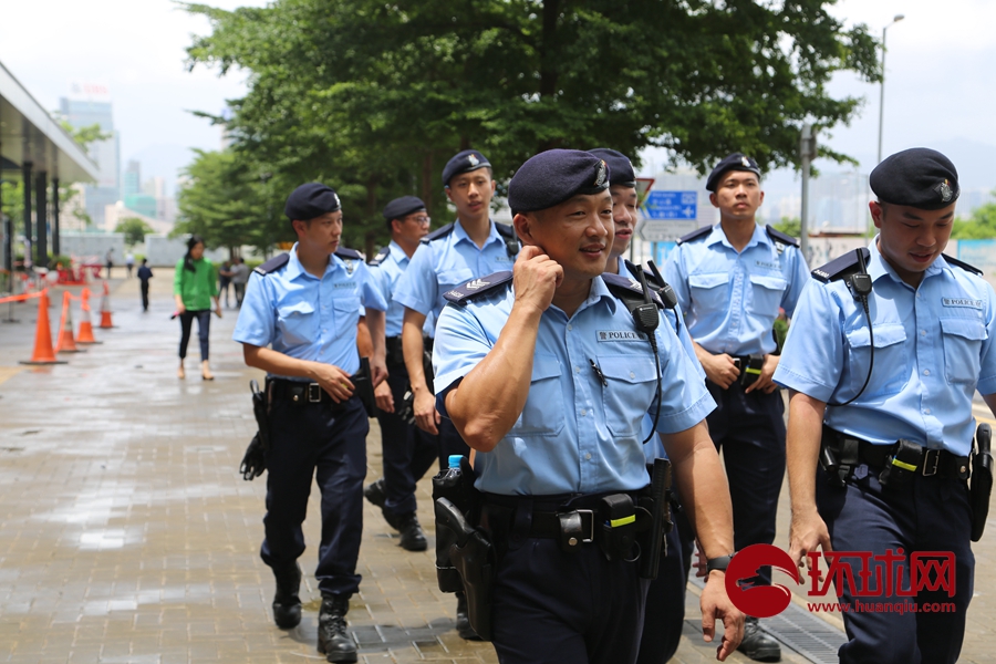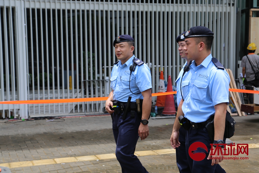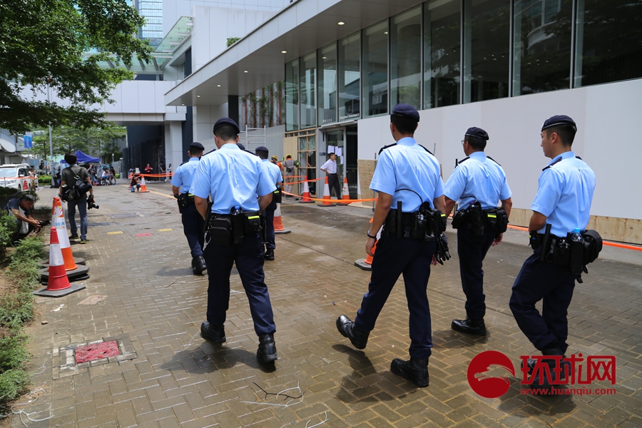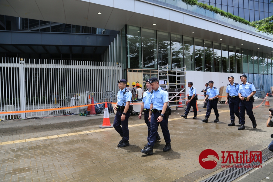 7月1日晚,一些极端激进分子借口反对香港特区政府有关条例修订,以极为暴力的方式冲击立法会大楼,肆意损坏立法会设施。 7月4日下午,香港警察在立法会和政府大楼外巡逻并维持秩序。从现场的情况来看,现场较为平静。值班人员表情平静,下午出现部分支持反对派的极端市民,在现场干扰立法会外的媒体采访,但也及时被警方制止。(摄影:环球时报-环球网 陈青青 杨升)
