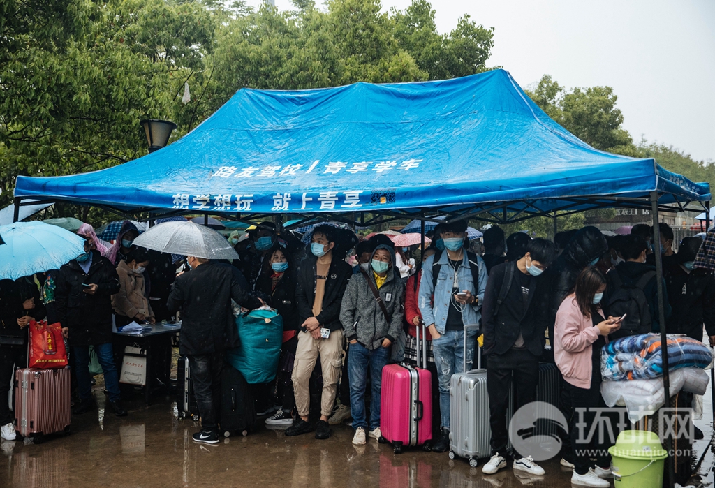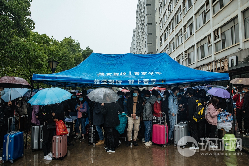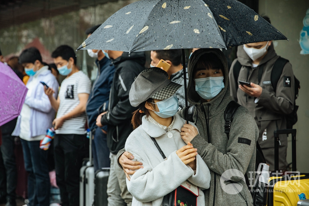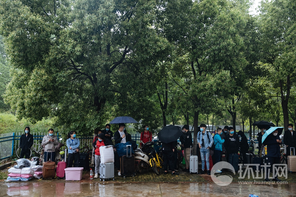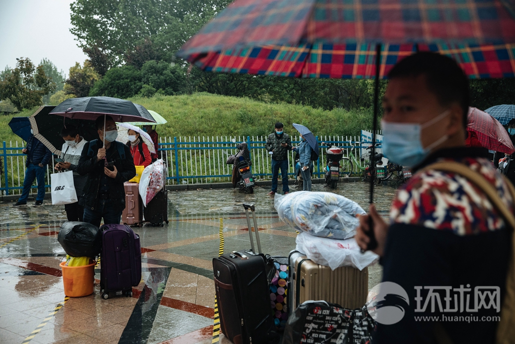 2020年4月20号,求职者在武汉富士康工厂门口排队等待面试。尽管武汉下着雨,仍有几百人前来求职。(环球时报-环球网记者 李昊/摄)