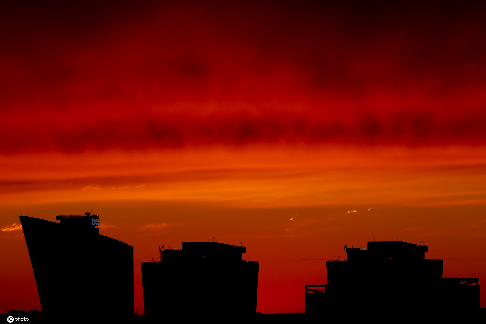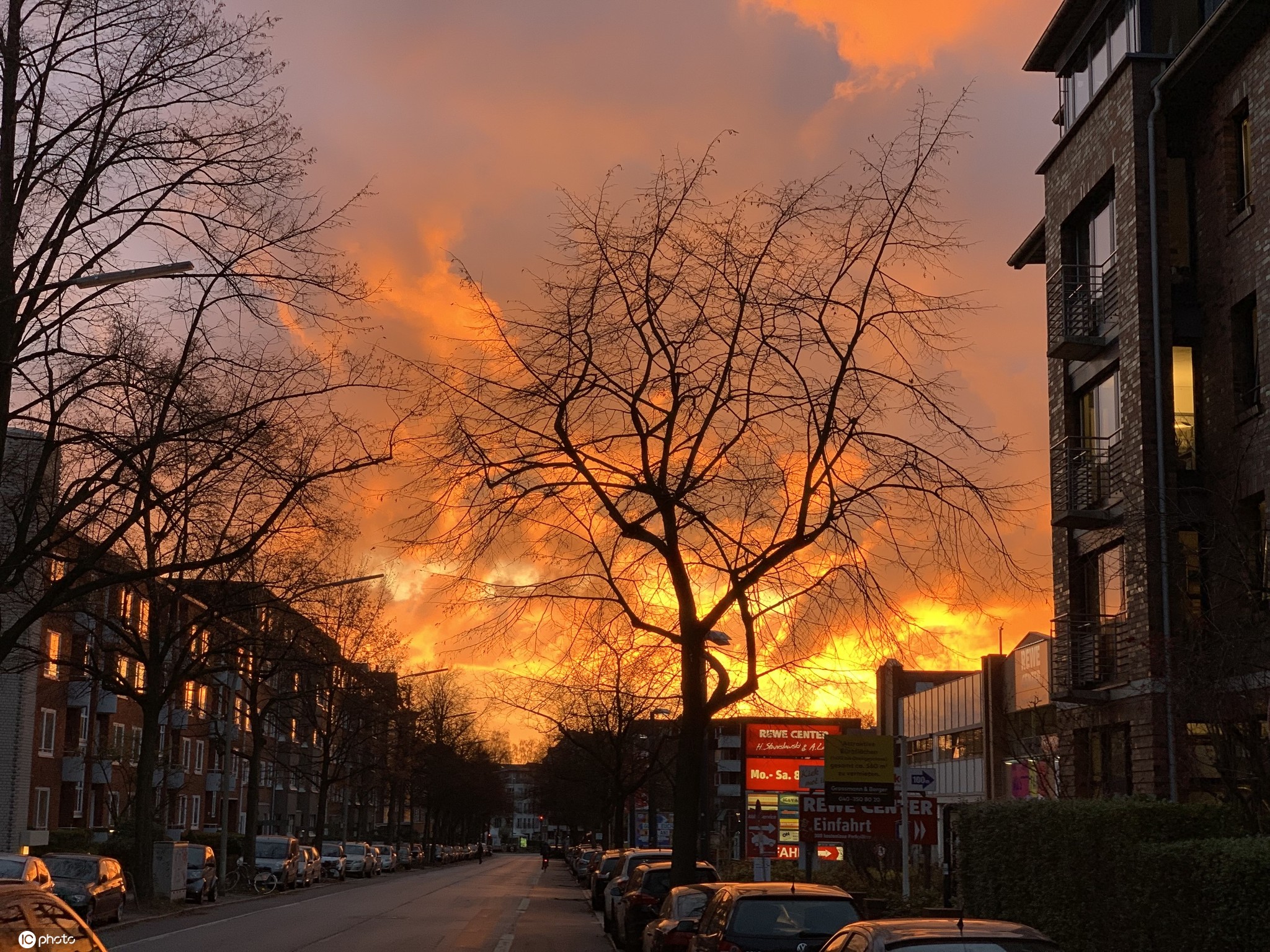当地时间2018年11月27日,德国汉堡,日落时分,当地天边现火烧云,天际被赤色晚霞云染成通红一片,好似着火了一般。(来源:东方ic)