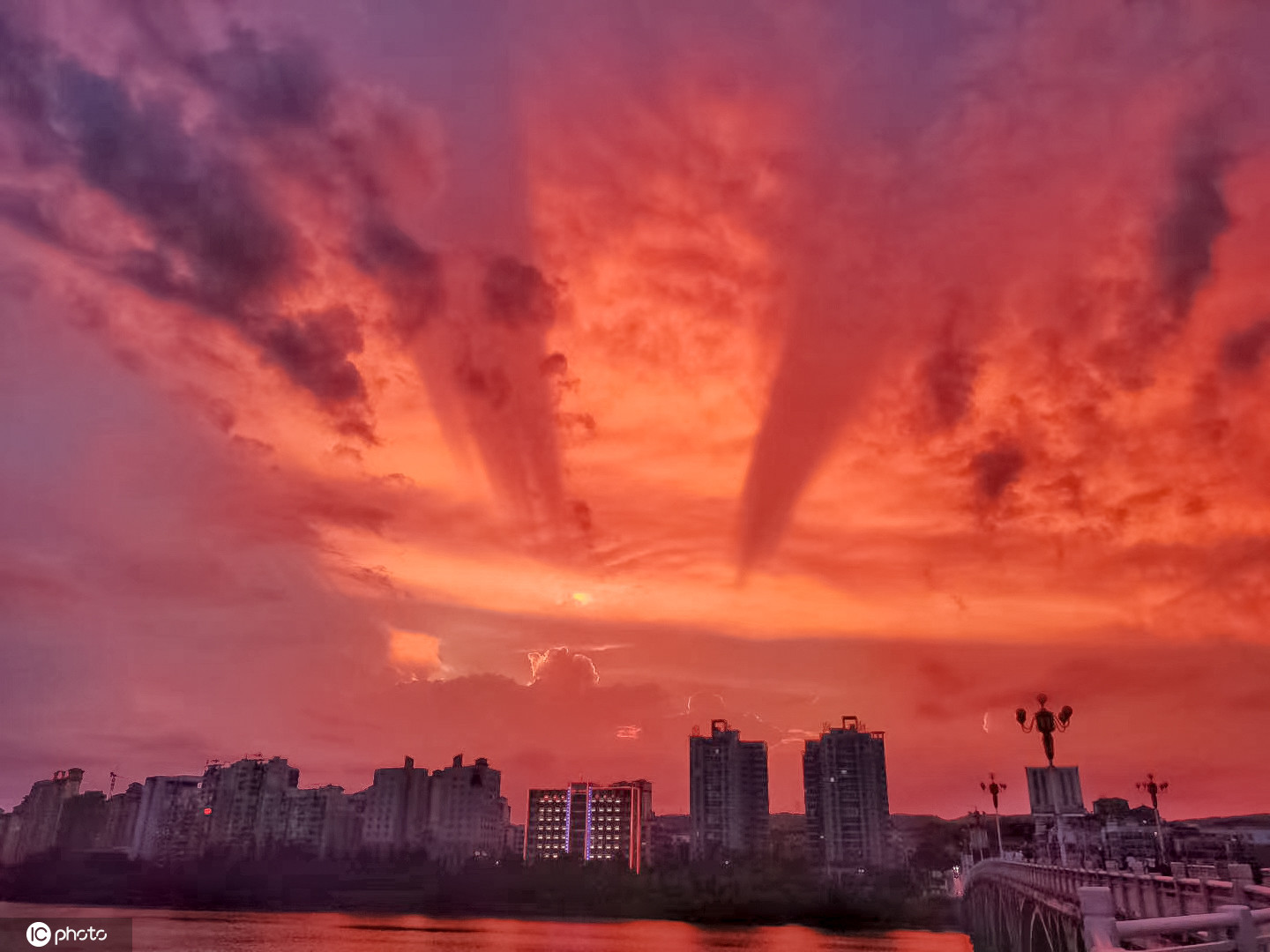 2020年8月3日,湖北宜昌,傍晚奇特的异景映入眼帘,五彩缤纷的色彩把宜昌装点得更耀眼,更夺目,更加雄伟壮观。(来源:东方ic)