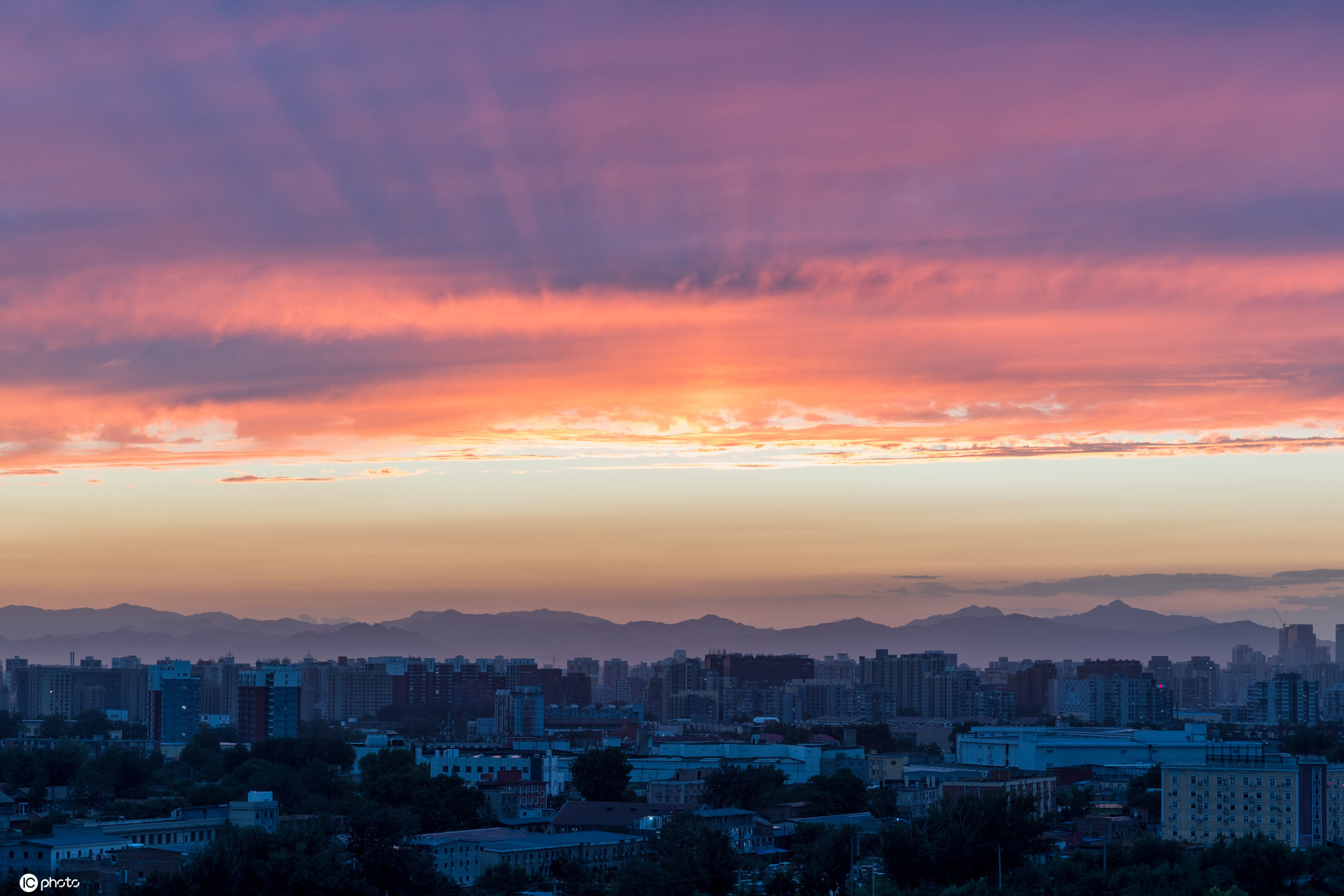 2020年8月31日,北京。今天北京的天空再现绝美景色,云层和大地中间夹着一线红霞堪比油画。(来源:东方ic)