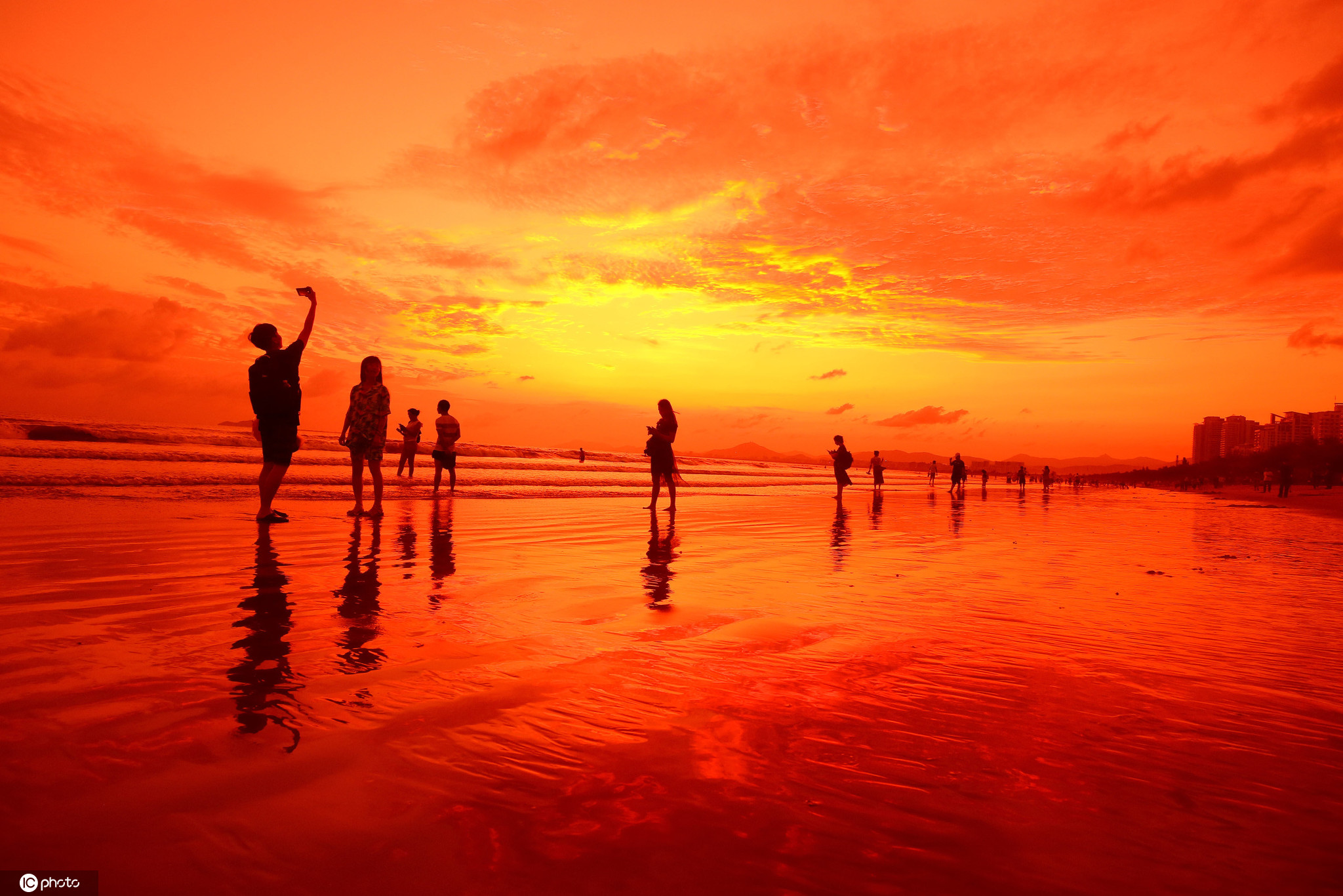 2019年4月22日,海南三亚,人们在海南省三亚市三亚湾海边美丽晚霞中游玩。(来源:东方ic)