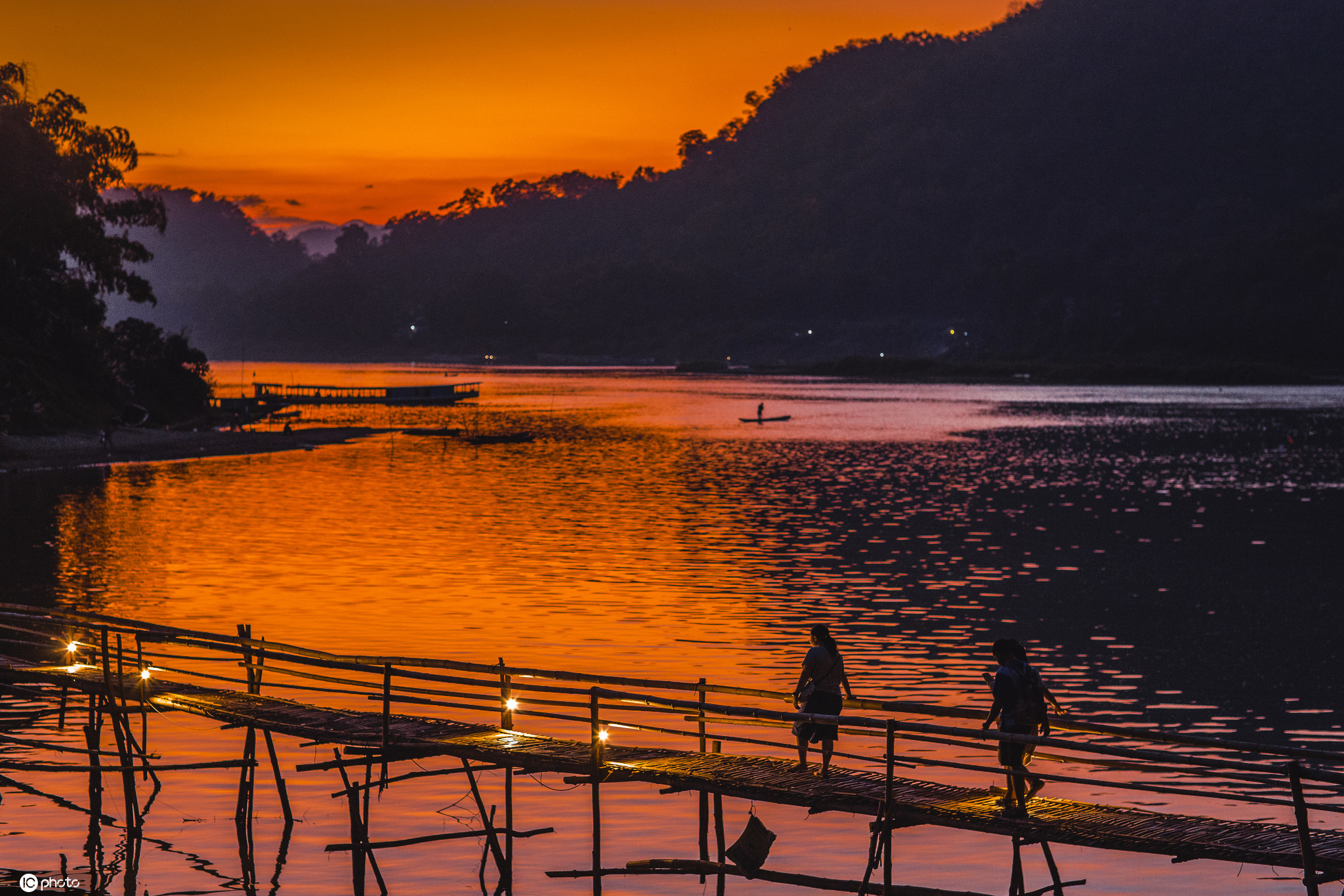 2019年11月19日,老挝老挝琅勃拉邦省。湄公河的晚霞让人仿佛被满池的碎金笼罩。(来源:东方ic)