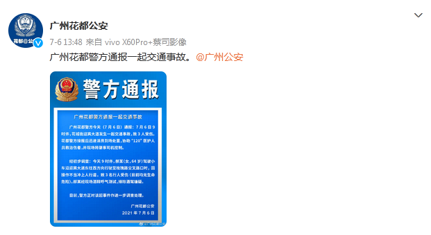 广州花都警方今天(7月6日)通报:7月6日9时许,花城街迎宾大道发生一起交通事故,致3人受伤。花都警方接报后迅速派员到场处置,协助“120”医护人员救治伤者,并现场将肇事司机控制。