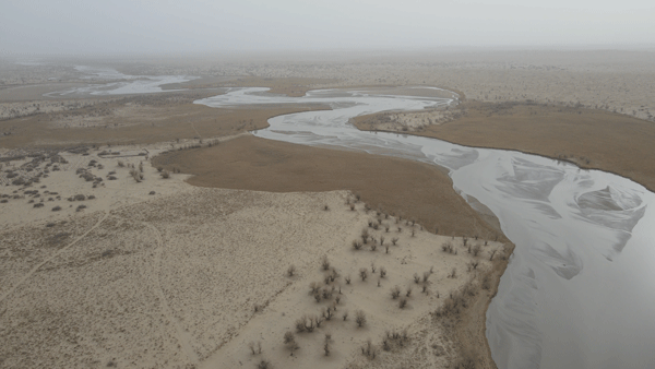 从高空俯瞰,可以清楚地看到沿河生态系统依河而生,伴河而存。河两岸的沙地上稀疏点缀着还没有长出叶子的胡杨、红柳、芦苇、骆驼刺等荒漠植被,形成了一条东西宽五到十公里的生态走廊。在此之外的远方,全都是无边无际的荒漠黄沙。