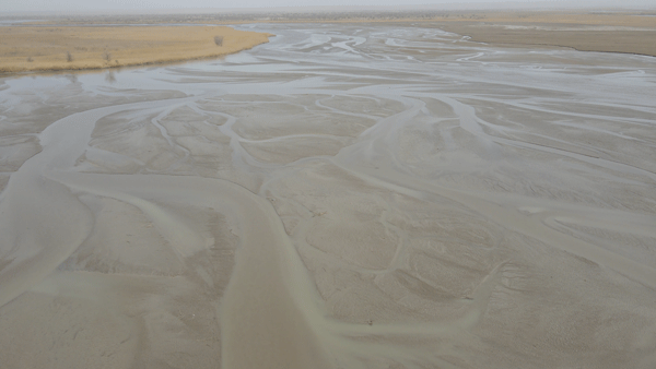 升起无人机,顿时悟到了为什么对克里雅河,史书记载和民间说法都有“来而不定”、“漂移不定”之辞。克里雅河河水随着季节性洪水而摆动漂移,浅浅的河床在大漠中绘画出了神奇瑰丽的纹理。大河又如天神抛下的一条闪亮缎带,缠裹着两岸的红柳和胡杨,飘飘渺渺,一起游向大漠的最深处。