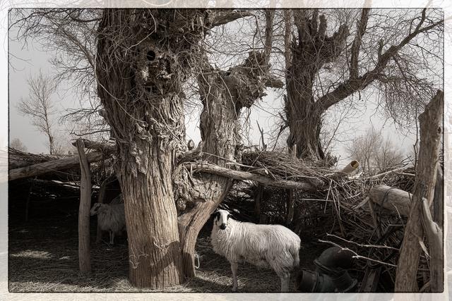 前方逐渐密集起来的胡杨林似乎预示着大漠深处有人家。果然,河滩上出现了几只散漫的羊。