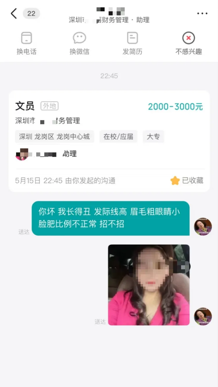 这条名为《这说的是人话吗?太离谱了!》的网帖显示,当事人陈女士看到深圳市欣X财务管理有限公司在招聘文员岗位,月薪为2000-3000元,位于深圳市龙岗区,于是在Boss直聘上向对方了解具体情况:“您好,不知道这个岗位是否还在招人,我仔细查看了您发布的职位信息,觉得自己比较适合,希望能得到您的回复。”没想到的是,对方随后回复,“不行,太丑了。”陈女士感觉非常无语和气愤。