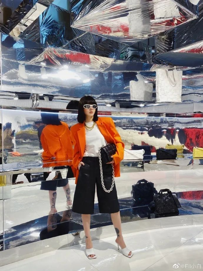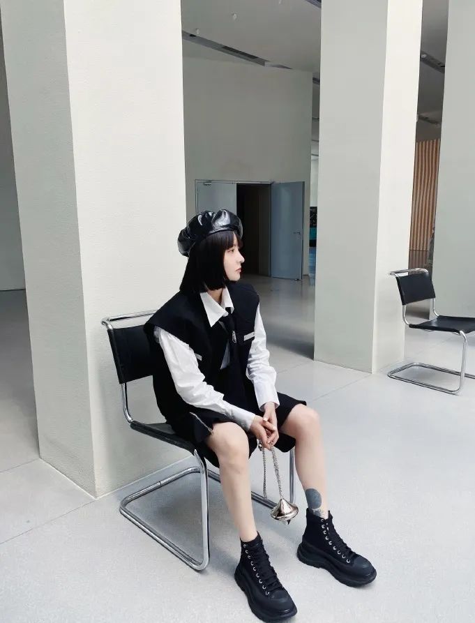 造型师Fil小白的穿搭风格就非常符合无性别差异的“小男孩风”,衬衫、马甲、中裤,踩一双系带靴,再扣上一顶贝雷帽,中性酷炫。