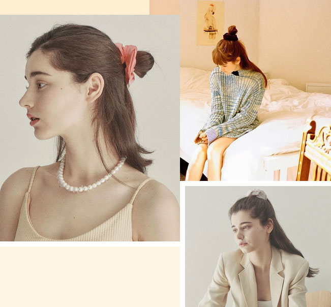 同样复古感十足的还有这种花色材质超多选择的大肠发圈。梳马尾、丸子头、半丸子头,都可以打造。