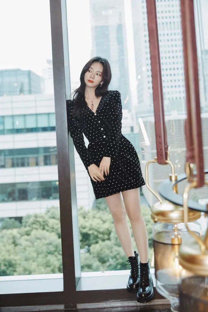 而昨天出席活动的谭松韵一身V领丝绒黑裙,柔软的大波浪甜度满分,再加上一双马丁靴,为整体造型又添了一抹酷炫,状态好得冲上了热搜第一。
