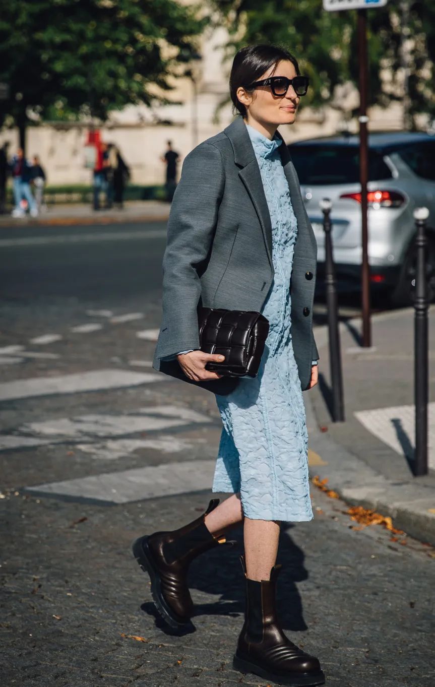 宋妍霏用雾霾蓝色的皮衣套装搭配厚底马丁靴,宽松的中裤和分量感十足的靴子,修饰的腿型更加纤细,亮面漆皮加上铆钉的设计为造型带来点睛之笔。