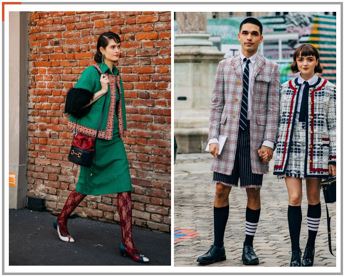 粗花呢的风格不止是优雅淑女,各种混搭也为粗花呢面料创造出更多可能性。如果你觉得一整套粗花呢有点束缚,那就不妨从混搭开始入手粗花呢单品吧。