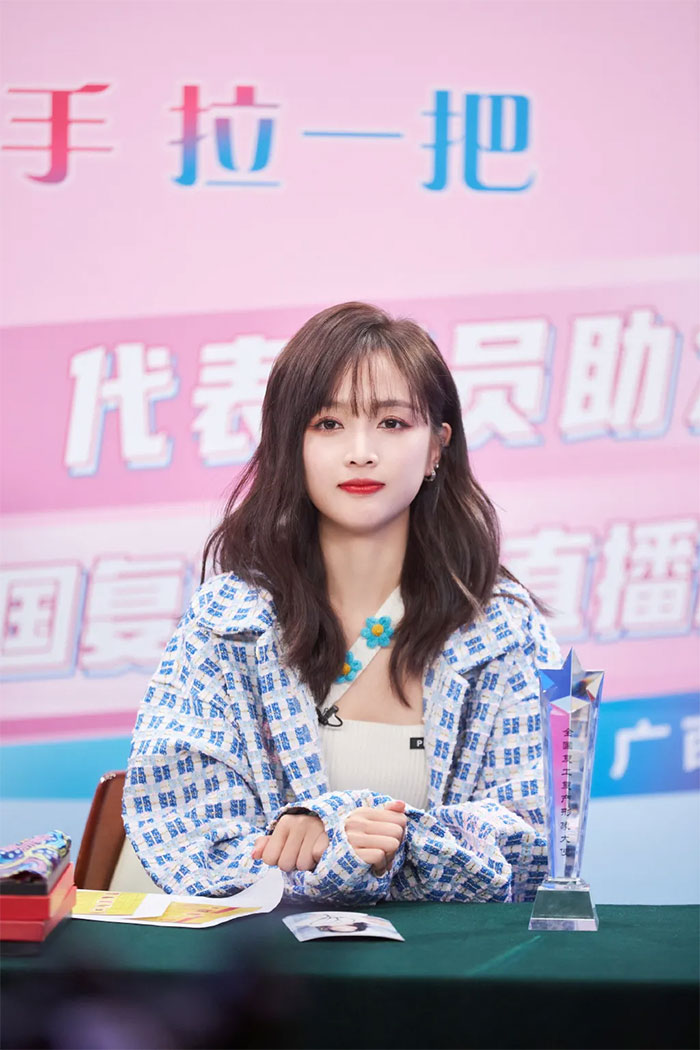 助力直播的吴宣仪则选择了一件蓝白格纹的粗花呢外套,灯笼袖的设计和清新的水蓝色,整个人看起来清甜软糯。内搭抹胸款针织上衣,斜绑带的上的立体“小花”点缀也充满亮点,就像是飘着朵朵白云的碧蓝天空,清新可爱。