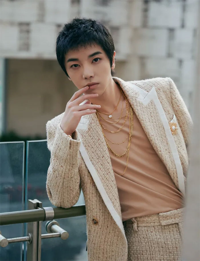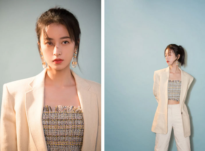 除了粗花呢面料拼接的单品,周雨彤还用过一件粗花呢抹胸搭配白色廓形西装,编织的抹胸边缘处自然散开,为造型带来更多新意,帅气又带着点小性感。
