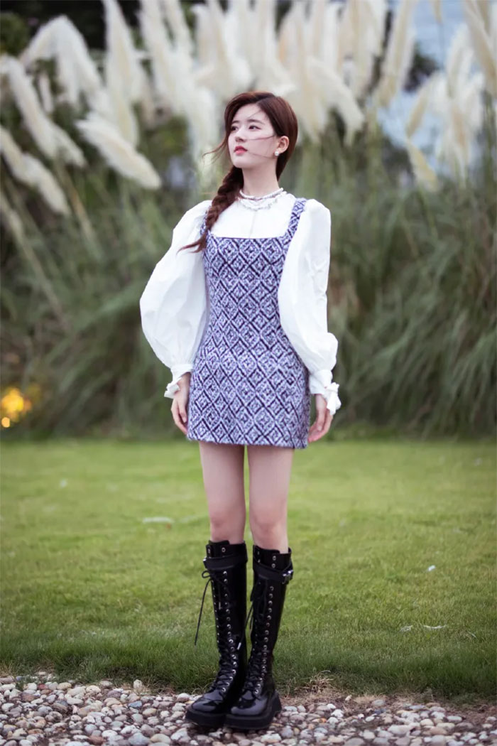 小甜心露思的裙子好像永远也穿不完,这不宫廷灯笼袖白衬衫和菱格纹粗花呢吊带假两件小裙子,搭配漆皮膝下靴又糅合了一点酷,像是秋日里的一杯加了奶油的黑咖啡,甜酷Girl上线!