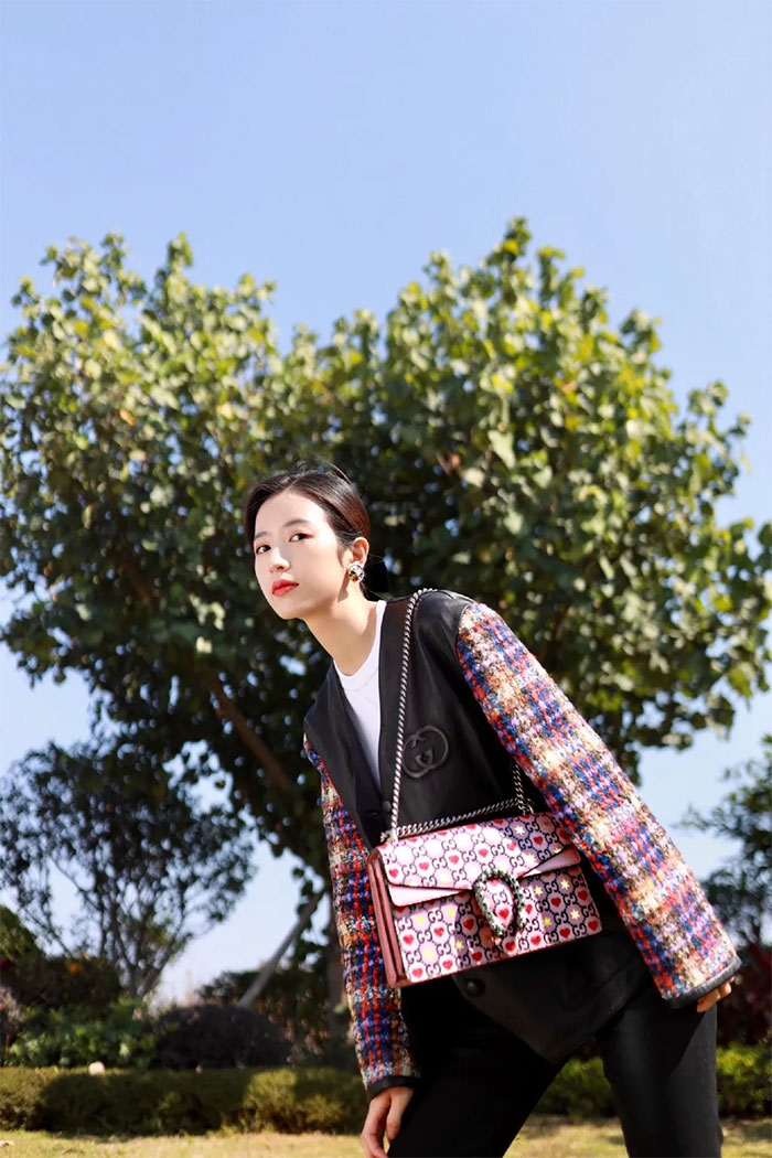 周雨彤的这件外套,皮面和袖子部分的粗花呢拼接,既有皮衣的酷又有粗花呢的优雅,红蓝黄的配色在阳光下显得格外温暖。
