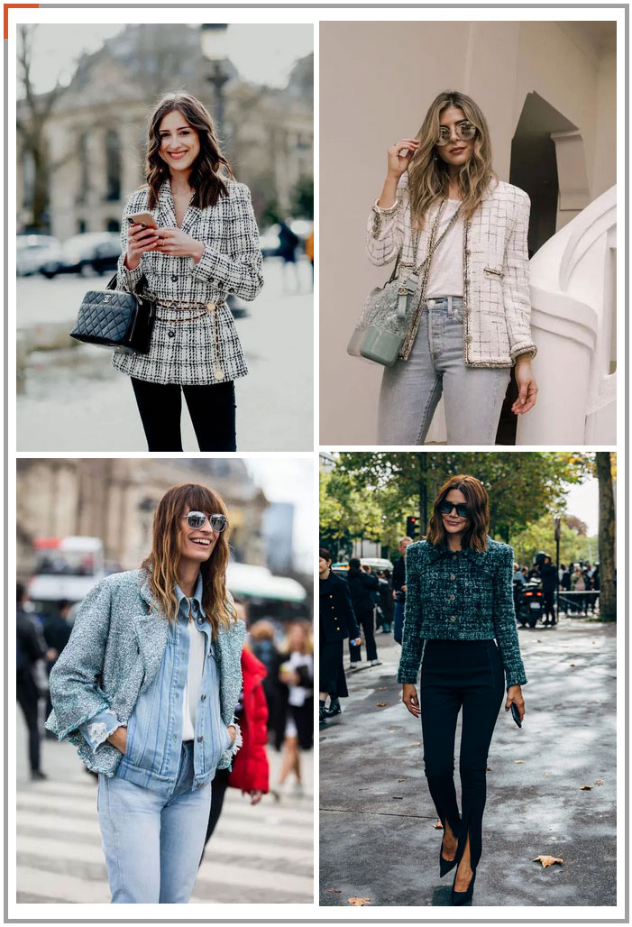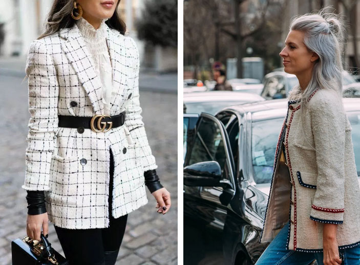 要说粗花呢最常见的穿法就是套装了,外套搭配筒裙,高级感十足,优雅满分!